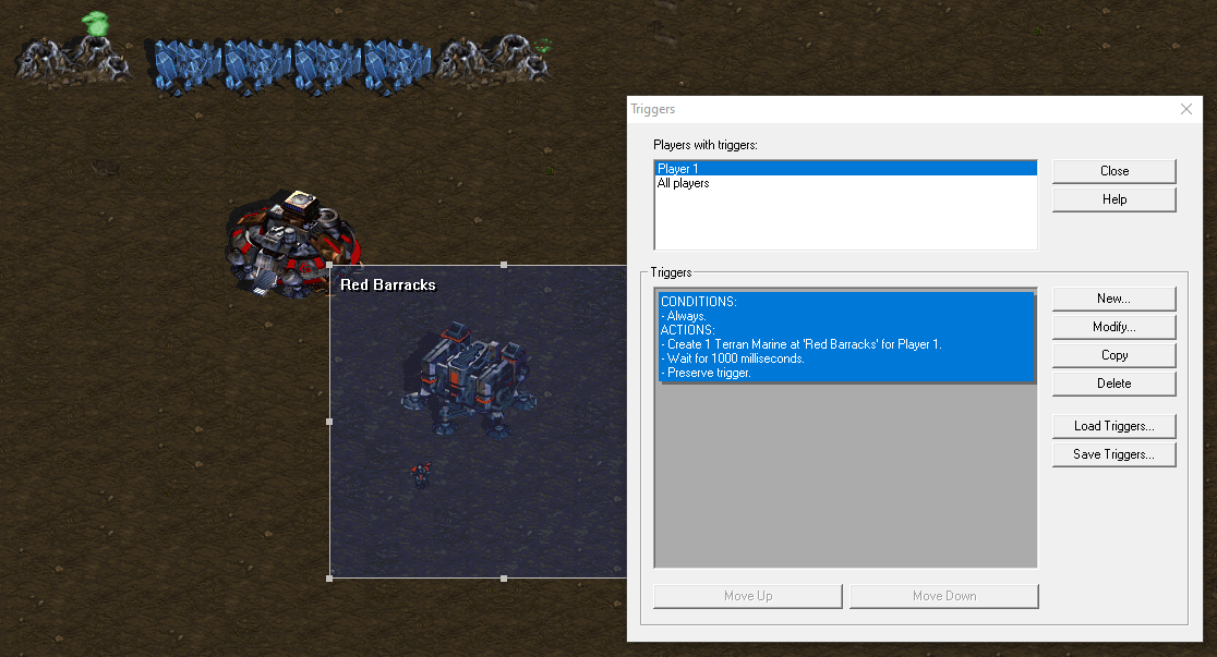 StarCraft has a map editor called StarEdit. I decided to check it out after many hours playing the game. I quickly learned how to modify the terrain, and place units and buildings. However, I could not figure out how to make the AI work, or how to get cool things to happen.