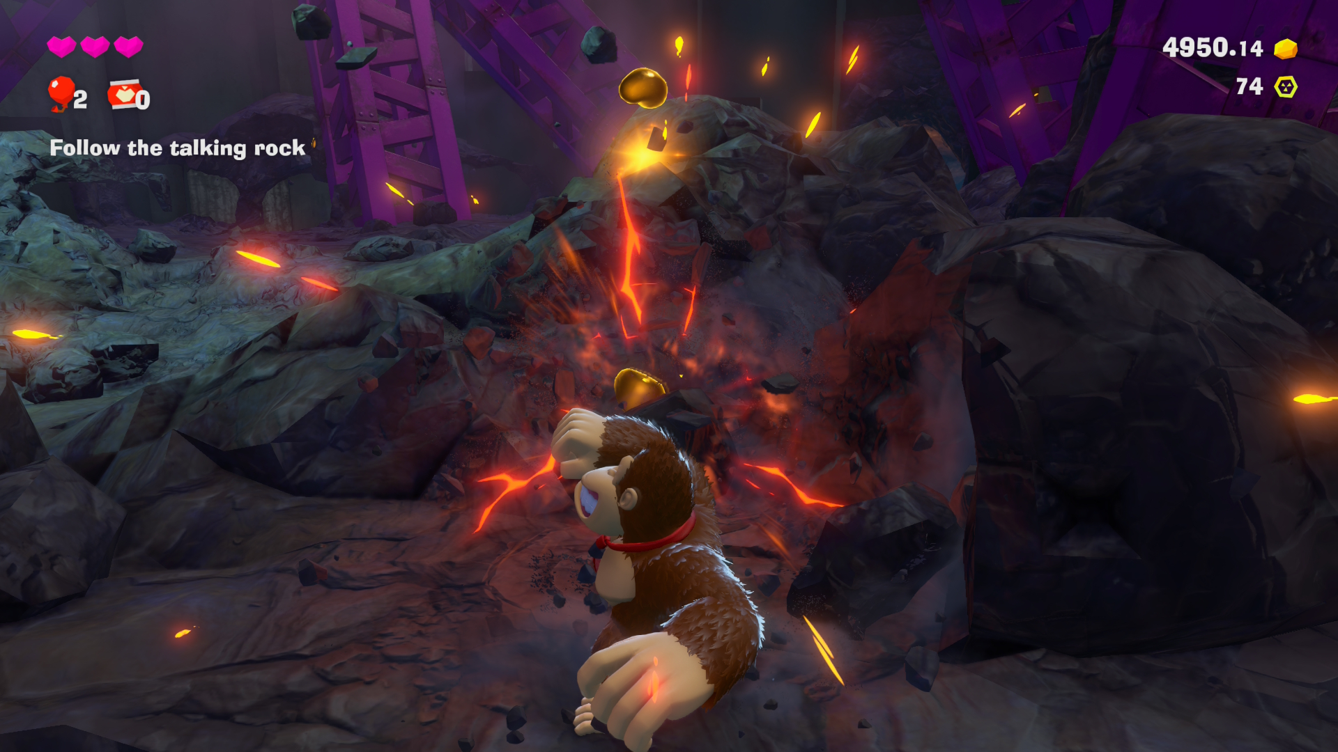 At the start of the game, DK is mining for Banandium Gems, when Void Company (the bad guys) arrives and steals all of the Banandium Gems. Donkey Kong finds a little void rock person, and he sets out to get his gems back. Together, they chase Void Company down to the next layer. The pair help out the Kong Elder, who throws a concert. This changes the void rock person into a real person: Pauline! The Elder teaches DK “Bananza,” which allows him to transform into a giant monkey. In Bananza form, DK is able to smash through harder materials, and just punch harder in general.