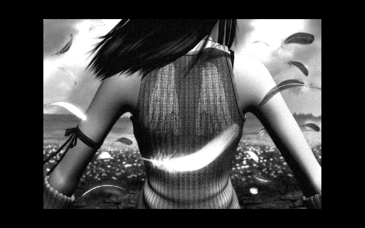 Final Fantasy VIII Screenshot - the back of Rinoa in black and white. She has angel wings on the back of her shirt, and feathers are falling around her.